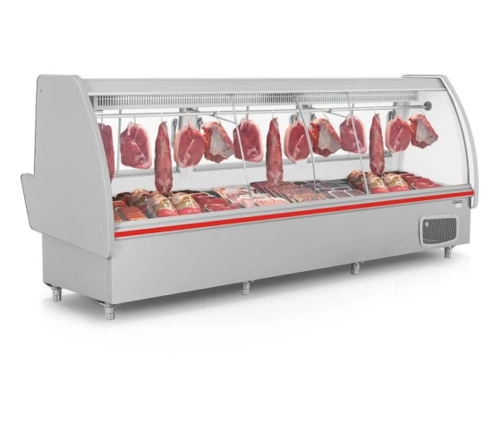Balcão Frigorífico Açougue; Conservação e Exposição de carnes (não congeladas); Refrigeração: Estática com evaporador aletado na parte superior e placa fria na base; Temperatura: 0 a +7C; Degelo: Manual; Controle de Temperatura: Termostato; Revestimento Interno: interno branco; Revestimento Externo: externo cinza; Revestimento Externo: Cabeceira: externo em aço pré-pintado, interno plástico; Iluminação LED (interna), com interruptor; Tendal; Simples em alumínio com ganchos; Pés niveladores; Termômetro analógico; Opcional: Bandejas em aço inox; Vidros temperados sujeitos a condensação da umidade do ar; Equipamento certificado conforme Portaria Inmetro nº 371/2009; Produto destinado para uso comercial.