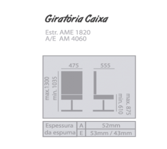 A cadeira giratória caixa sem braço possui assento e encosto produzido em espuma injetada de alta densidade anatômica revestida em tecido courvin, base com sistema de regulagem de altura a gás, com estrela secretária aço capa reforçada com sapata PP nylon e aro para apoio dos pés.