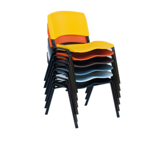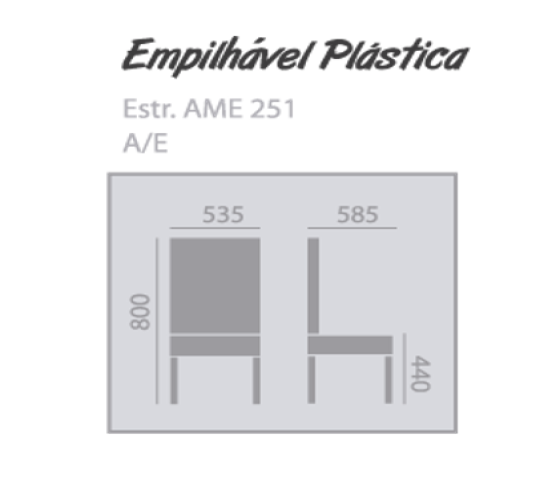 Cadeira empilhável para escritório, recepção, sala de convenções, auditório, igreja, escola, restaurante, hospital, clínica, estabelecimentos comerciais e uso geral. Possui encosto e assento confeccionado em polipropileno (PP) e estrutura em aço carbono.