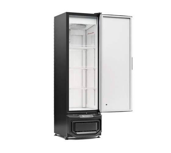 Conservação e Exposição de Cervejas e Bebidas (Água, Sucos e Refrigerantes); Refrigeração: Ar forçado com evaporador aletado; Temperatura: -6, -4, +1C ou +3C (Modo Economia); Degelo: Automático (frost free); Controlador eletrônico com indicador de temperatura; Revestimento Interno: Aço pré-pintado branco; Revestimento Externo: Aço pré-pintado preto; Porta cega em Aço pré-pintado; Com adesivo; Prateleiras aramadas; Placa Fria; 3 níveis reguláveis; Pés niveladores; Condensador estático, com ventilação natural; Equipamento certificado conforme Portaria Inmetro nº 371/2009.