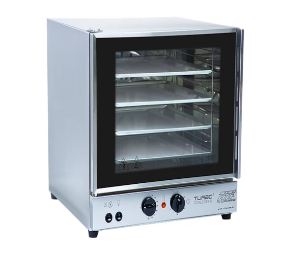 Compacto e de fácil manuseio, o Forno Elétrico Turbo Professional pode ser utilizado em pequenos espaços e frentes de lojas promovendo maior destaque dos seus produtos. Seu alto desempenho através do sistema de convecção, funcionalidades simplificadas, como a regulagem de temperatura e timer, faz dele o complemento ideal para o seu negócio, resultando em praticadade e agilidade na sua produção. Estrutura fabricada em aço inox escovado e aço inox brilhante; 4 assadeiras 35 x 35 cm; rack em aço carbono niquelado para 8 assadeiras; porta em vidro temperado com 4mm de espessura; sistema de convecção – motor 1550 RPM; temporizador – timer conta até 90 minutos; consumo de energia máxima 3,040 Kwh; resistência espiral tubular de 3000W; chave contatora de 30A para proteção do sistema elétrico; termostato para controle de temperatura (50°C - 250°C); fio em silicone 1,5 mm² máx. temp. 200°C; cabo elétrico 3 x 1,5 mm² x 1,0 m - plugue BR 180° 2P+T.